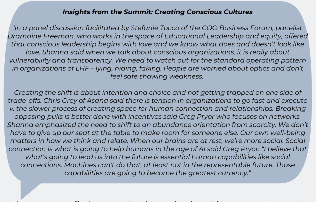 Conscious leadership fosters a kinder and more inclusive place for all. In a world in search of growth and advancement, it enables positive relationships, improves organizational productivity and sustainability, and elevates our collective impact. At a time when so much of our human and planetary future is at stake, it enables us to consider our greater impact on future generations and the wider world. – Leadership Forum Community Poll